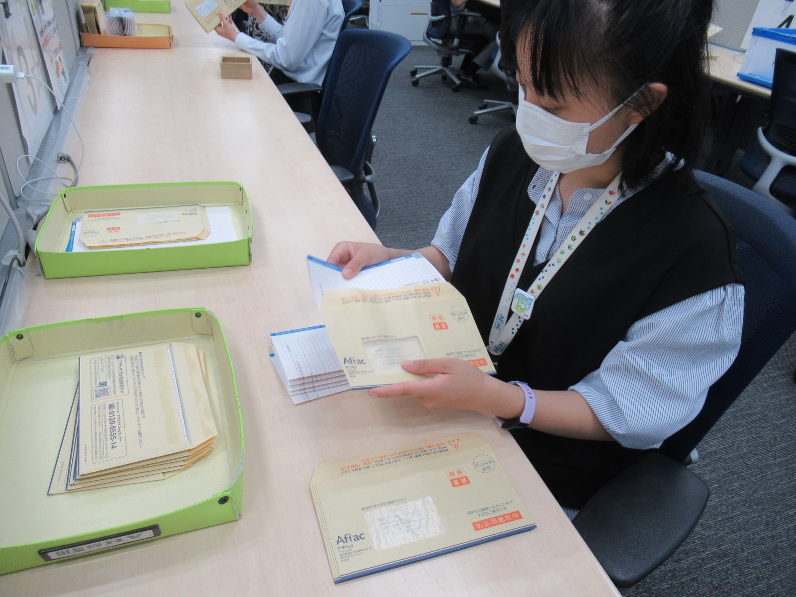 お客様や代理店などに向けた書類の三つ折り・封入・封緘を行う業務です。決められた位置で折る正確さと、スピードが求められます。封入前に、資材の汚れや破れがないか確認しながら行います。個人情報の記載された書類は、並び順を崩さないことが求められることもあるため、扱いには特に注意が必要です。