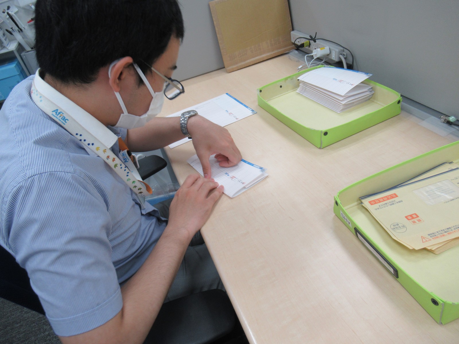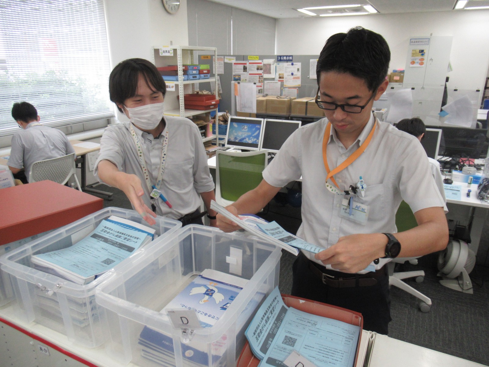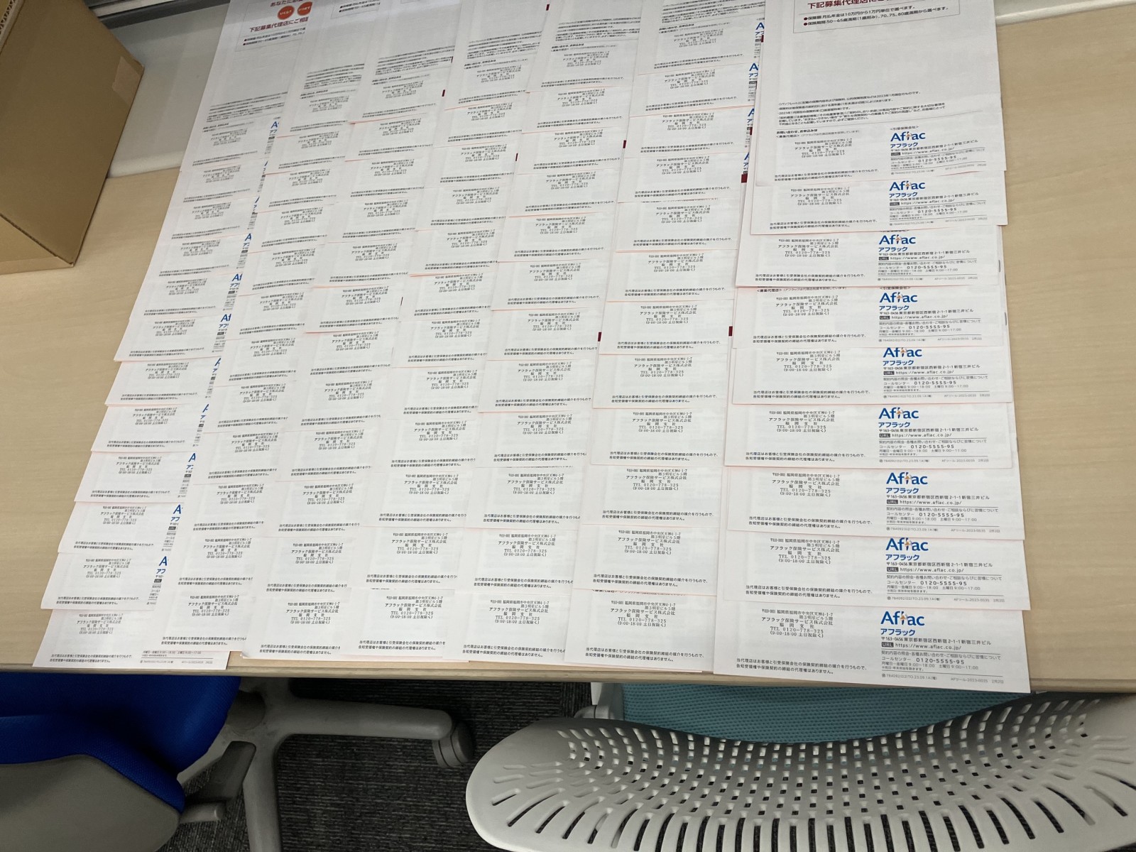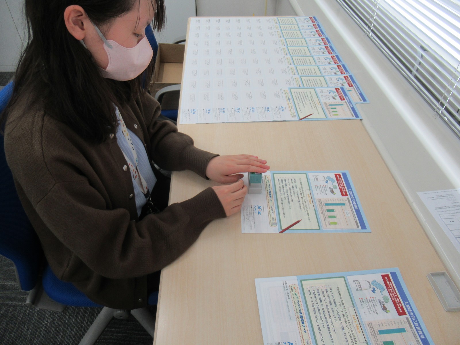 パンフレットや封筒に、アフラックの各部門のスタンプを押印する業務です。適切な濃さで文字が欠けないよう丁寧に作業することが求められます。業務によっては大きなロットで受託しているものもあり、進行係の社員が中心となって納品管理等も行っています。
